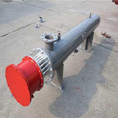 管道加熱器分為兩種模式:一種是采用管道加熱器內(nèi)部的法蘭式管狀電熱元件倒插在管道加熱器中的反應(yīng)釜夾套中加熱導熱油,將管道加熱器中的熱能傳輸給管道加熱器內(nèi)部反應(yīng)釜中的化工原料。